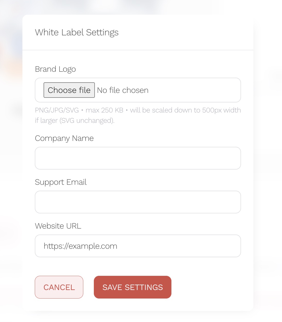 Plotësoni fushat me detajet e kompanisë suaj (si emri i kompanisë, emaili i suportit, adresa e faqes së internetit) dhe ngarkoni logon tuaj.