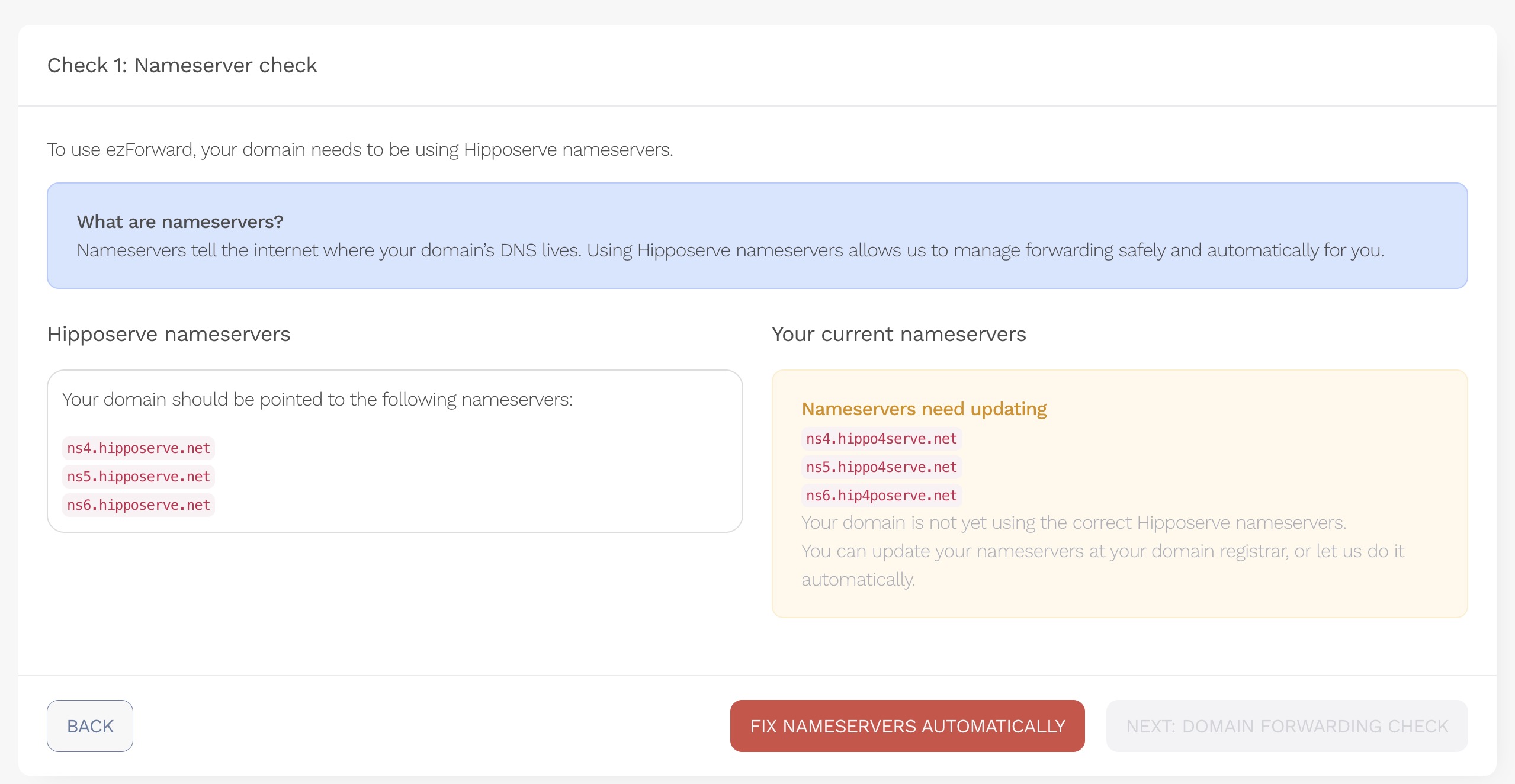 Për të funksionuar ezForward, domain-i juaj duhet të përdorë nameserver-at e Hipposerve.