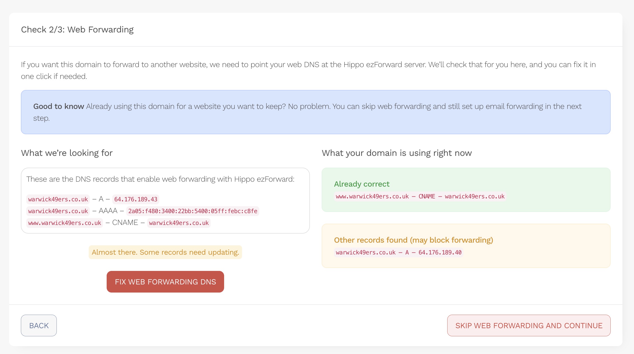 Nëse këto regjistrime mungojnë ose janë të pasakta, mund t’i rregulloni duke klikuar butonin Fix Web Forwarding DNS.