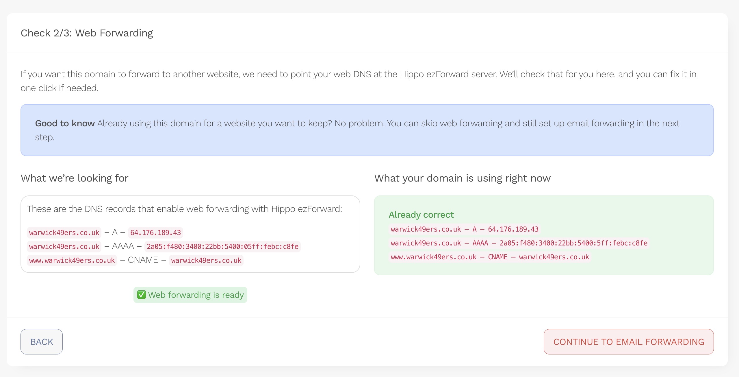 Çelësi për t’u siguruar që domain-i juaj ridrejtohet saktë — qoftë për trafikun e faqes së internetit apo për dorëzimin e email-it — është konfigurimi i saktë i DNS-it. Për fat të mirë, asistenti ezForward kontrollon dhe rregullon automatikisht DNS-in aty ku është e nevojshme, duke e bërë procesin të thjeshtë dhe të besueshëm.