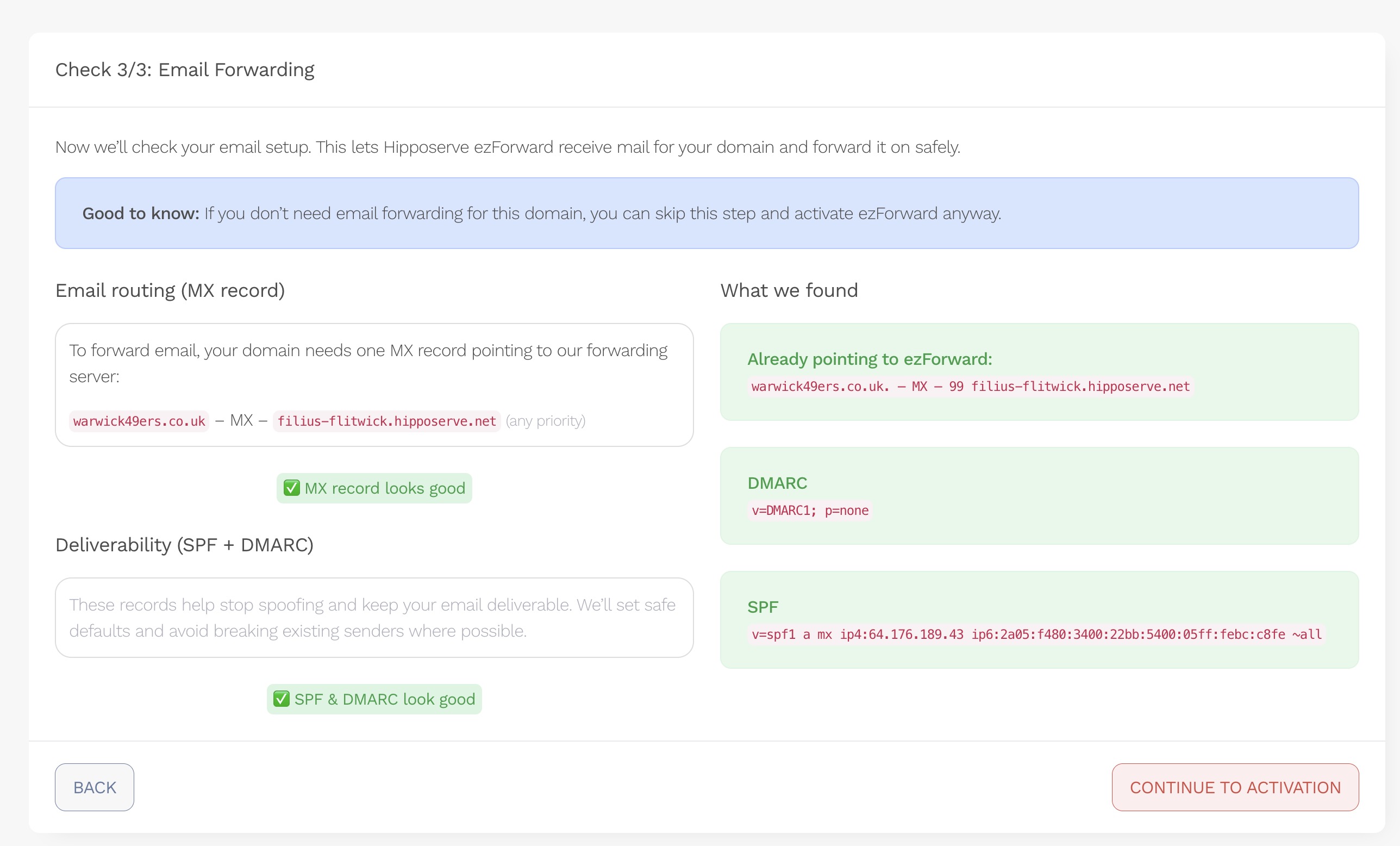 Ekrani i aktivizimit do të shfaqë një përmbledhje të konfigurimit tuaj të ezForward.