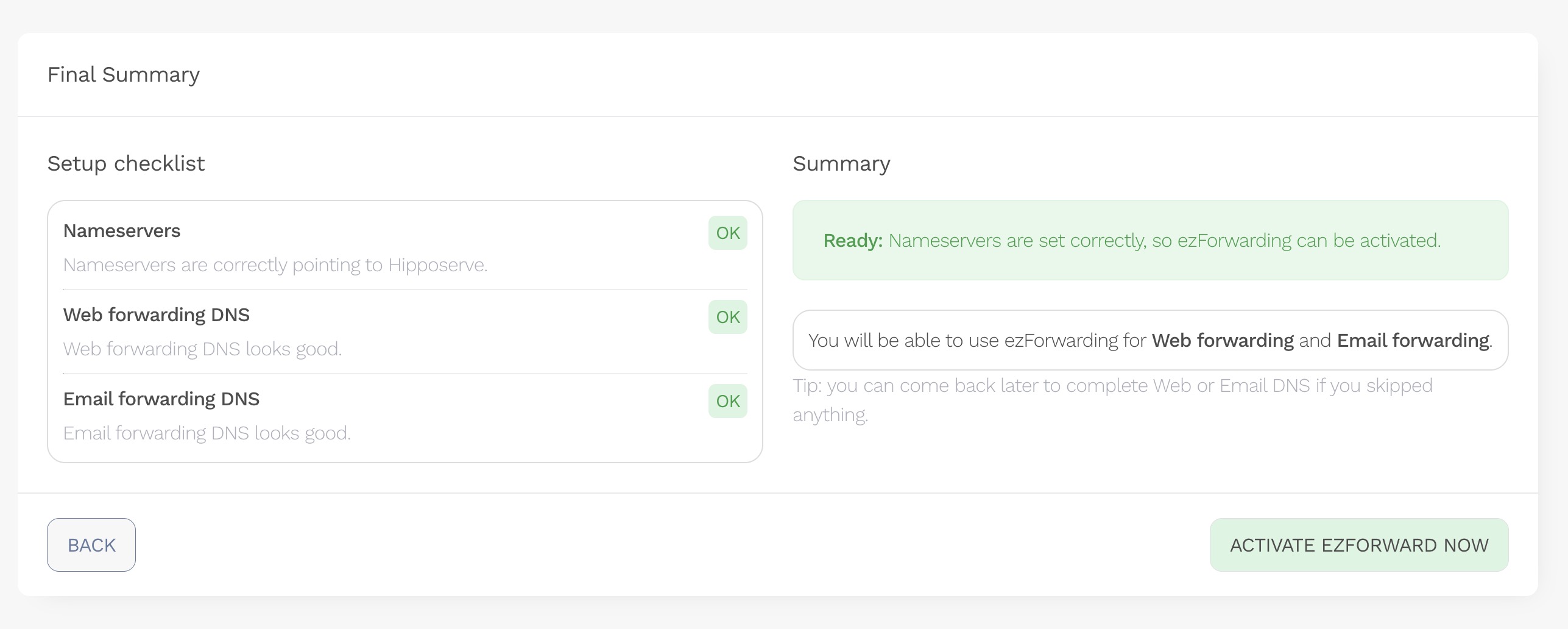 Kur të jeni të kënaqur me konfigurimin, klikoni Activate ezForward Now.