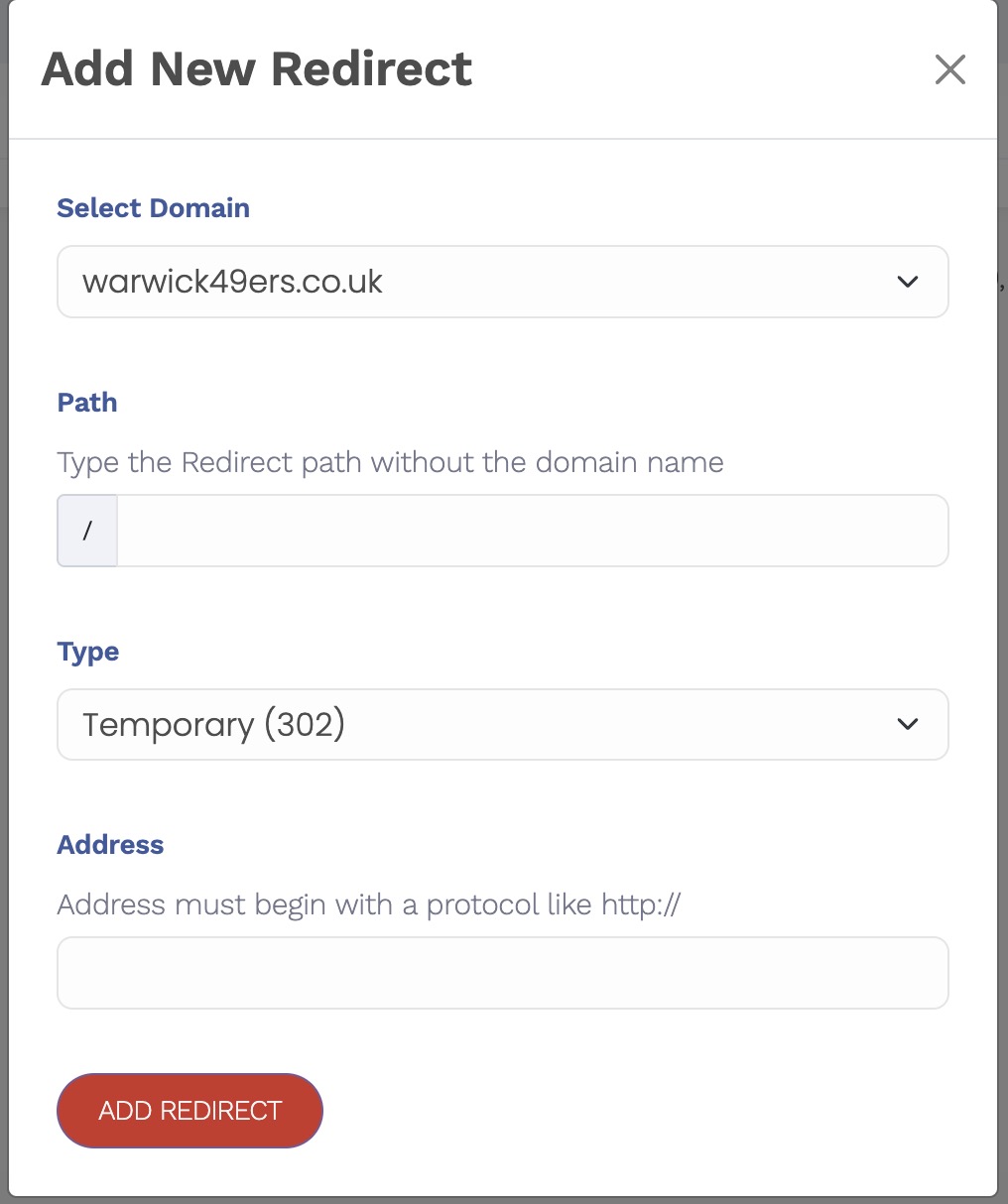 Nëse dëshironi të ridrejtoni të gjithë domain-in drejt një faqeje tjetër, thjesht lini bosh fushat e rrugës së redirect-it.