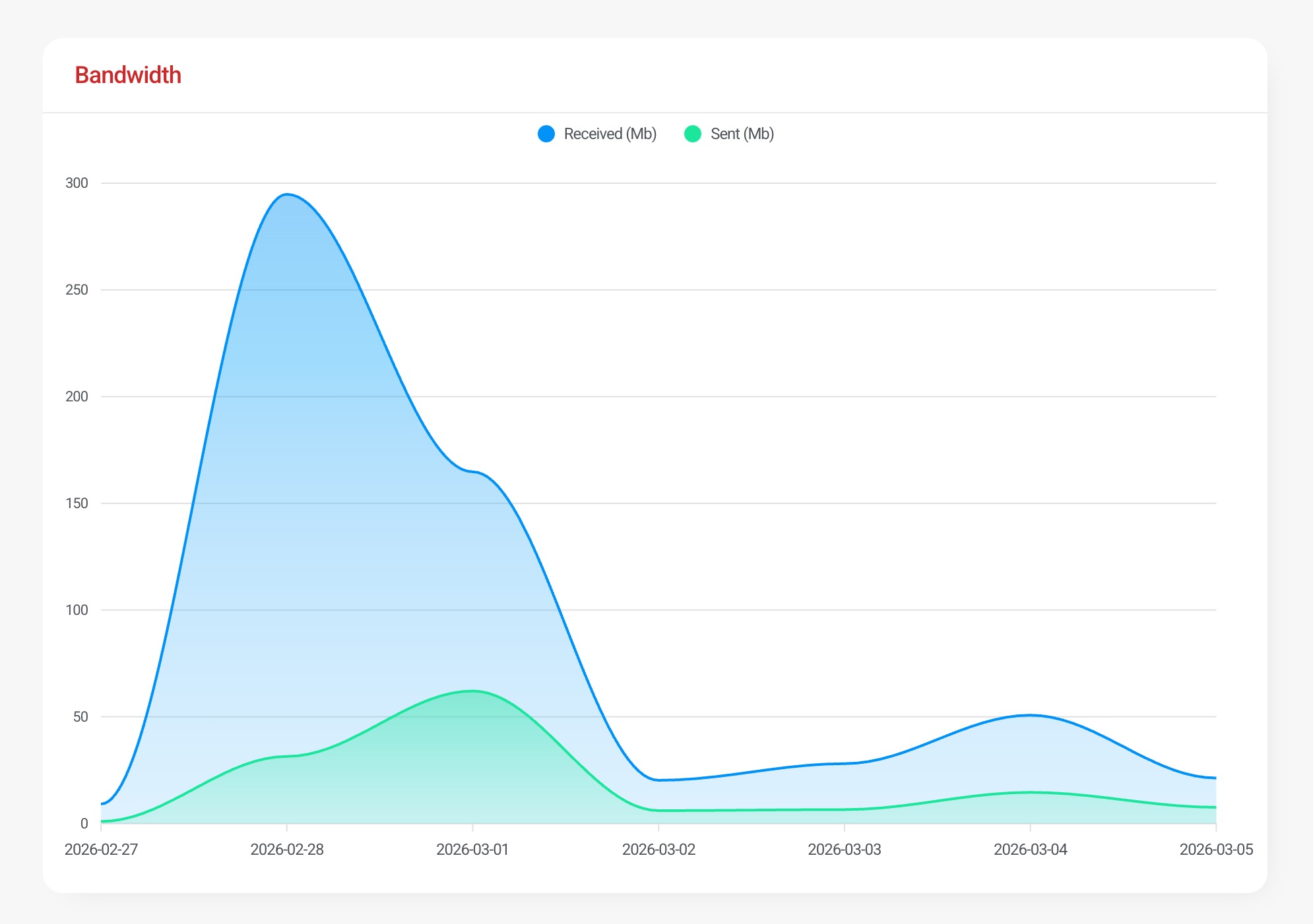 Seksioni Graphs në Hipposerve® vPanel ofron një pamje vizuale të aktivitetit të rrjetit të VPS tuaj. Këto grafiqe tregojnë sasinë e të dhënave që dërgohen dhe merren nga serveri juaj gjatë kohës.