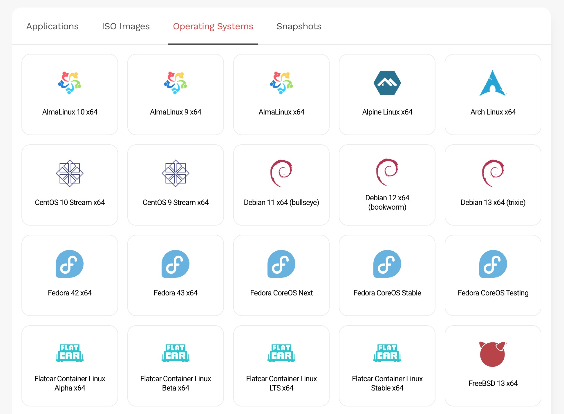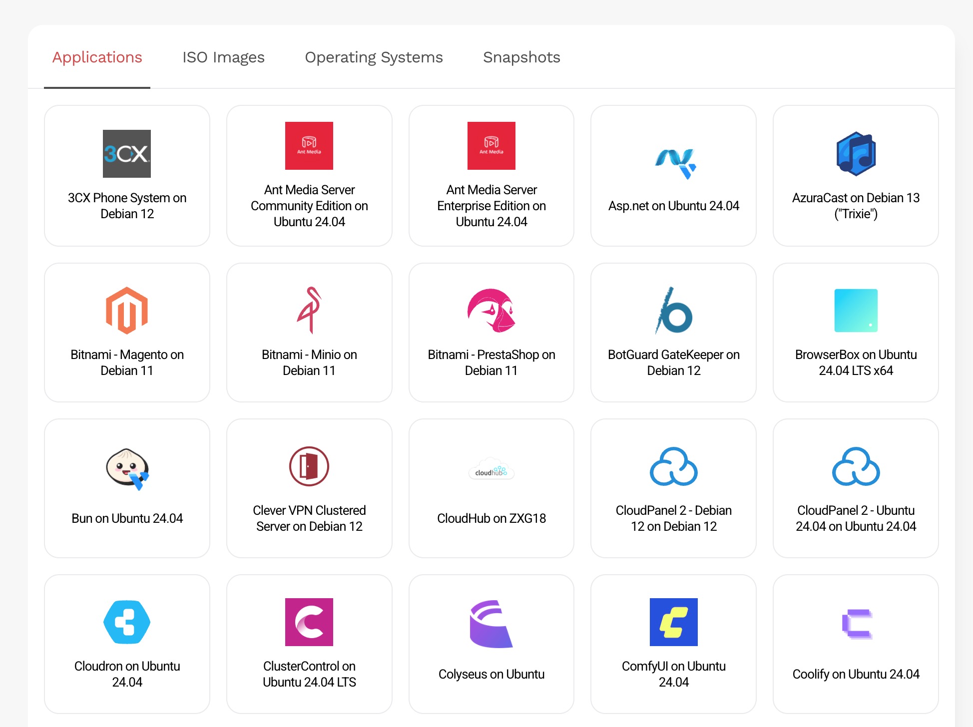 For your convenience, we provide a library of pre-prepared server images containing hundreds of the most popular operating systems and applications. These can be installed quickly and easily at the click of a button, allowing you to get started straight after provisioning.